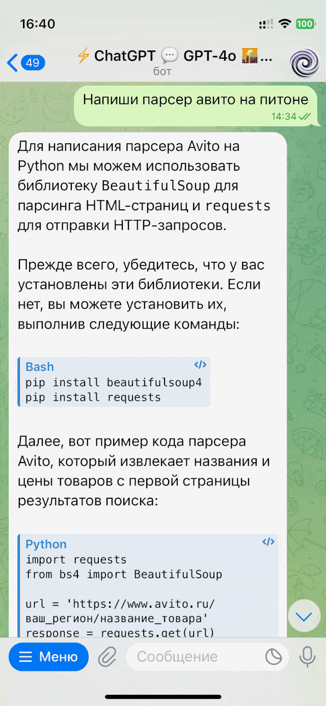 Использование ChatGPT в Telegram делает его всегда доступным и удобным инструментом. Независимо от времени суток и вашего местоположения, Вы можете получить все возможности искусственного интеллекта в вашем любимом мессенджере.